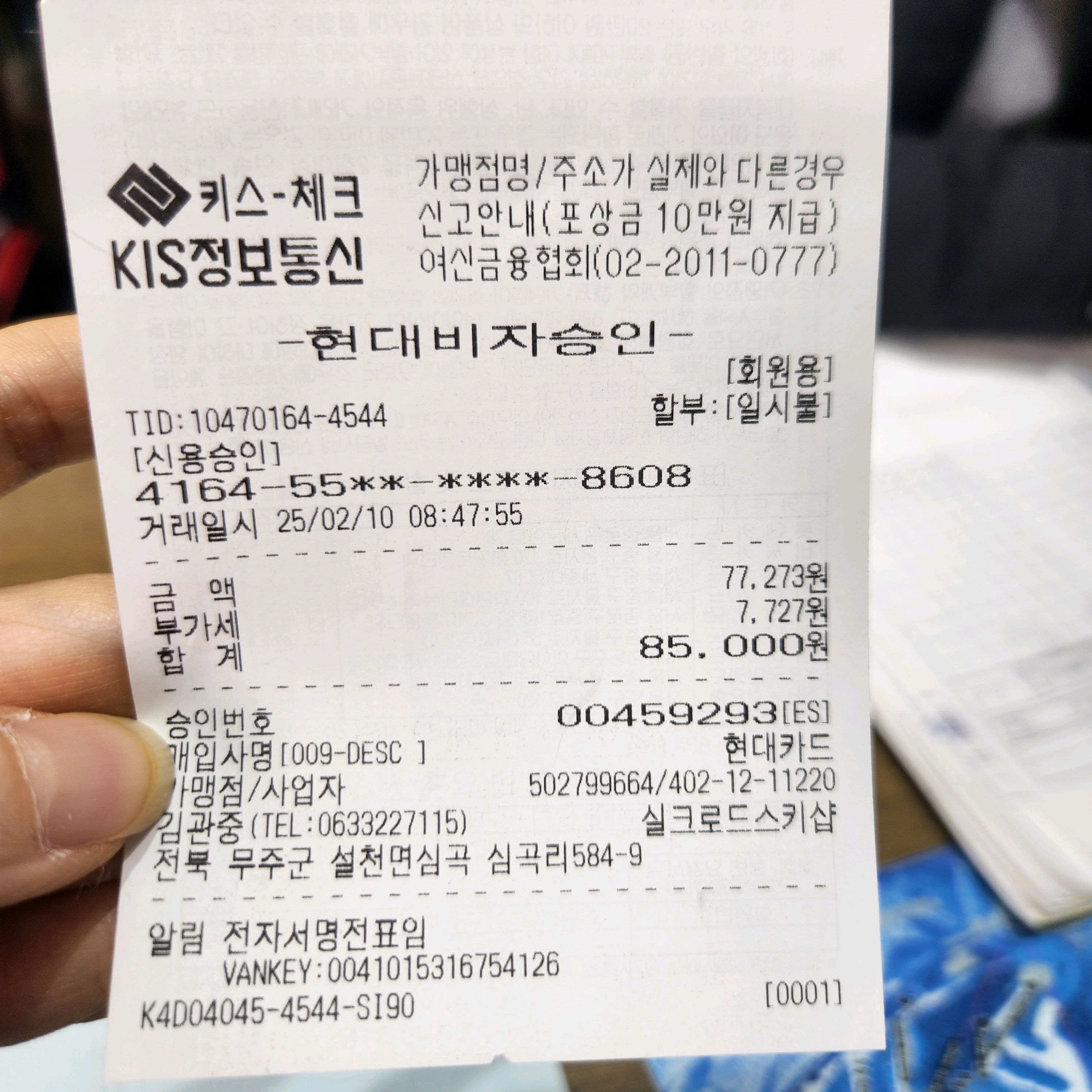 매 시즌마다 스키장방문하는데 스키샵은 매번 다른곳으로 다녔어요!! 이번에 실크로드 샵을 처음 방문했는데 너무 마음에 들어서 영수증 리뷰까지 남기네요!! 금액대는 주변 거의 비슷한데 장비부터 옷 그리고 바이저까지 너무 마음에 들었어요!! 특히 옷이 방수도 너무 잘되고 디자인도 예뻤답니다!! 탈의실 및 매잩 내부도 청결하고 사장님과 직원분들 모두 너무 친절해요!! 장비 픽업해주시는 분까지 너무 Sooooo친절!!! 아마도 단골 각!!!!! 음료도 주심!!! 최고