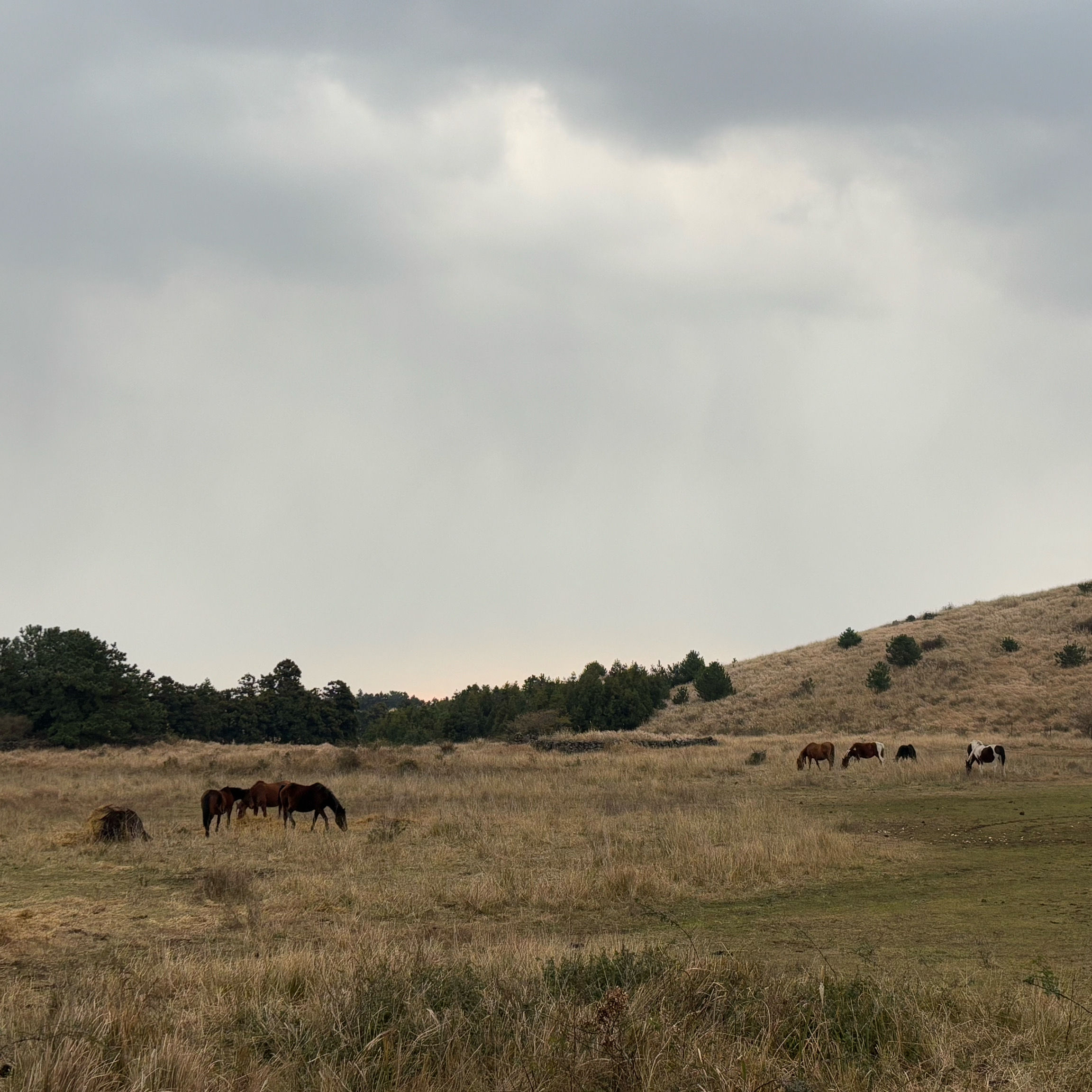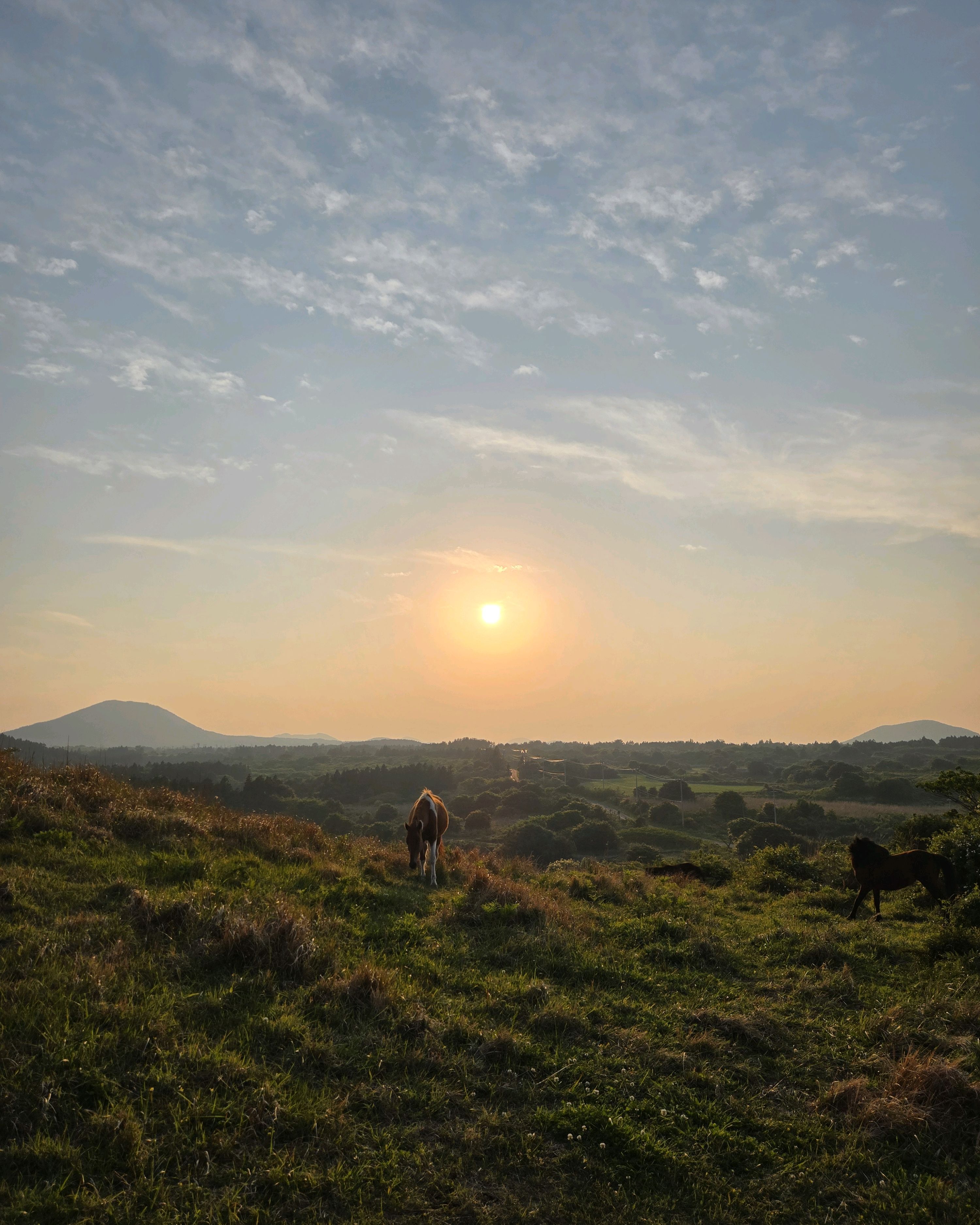 제주도에서 말을 탄 적은 어릴 때 한 번 말고 없고 목장에서 키우는 말만 봣지 오름 올라가는 길에 말이 잇을거라는 생각은 못했어요 ㅎㅎㅎ분화구까지 보고 내려오는데 말이 울타리 넘어 산책로에도 있더라구요! 말을 이렇게나 가까이 본 적은 성인되고 나서 첨인 것 같아요! 노을이 질 때쯤 사진을 찍으니깐 넓은 들판에 🐎, 태양까지 완벽한 분위기를 보여줬다고 하나,,?