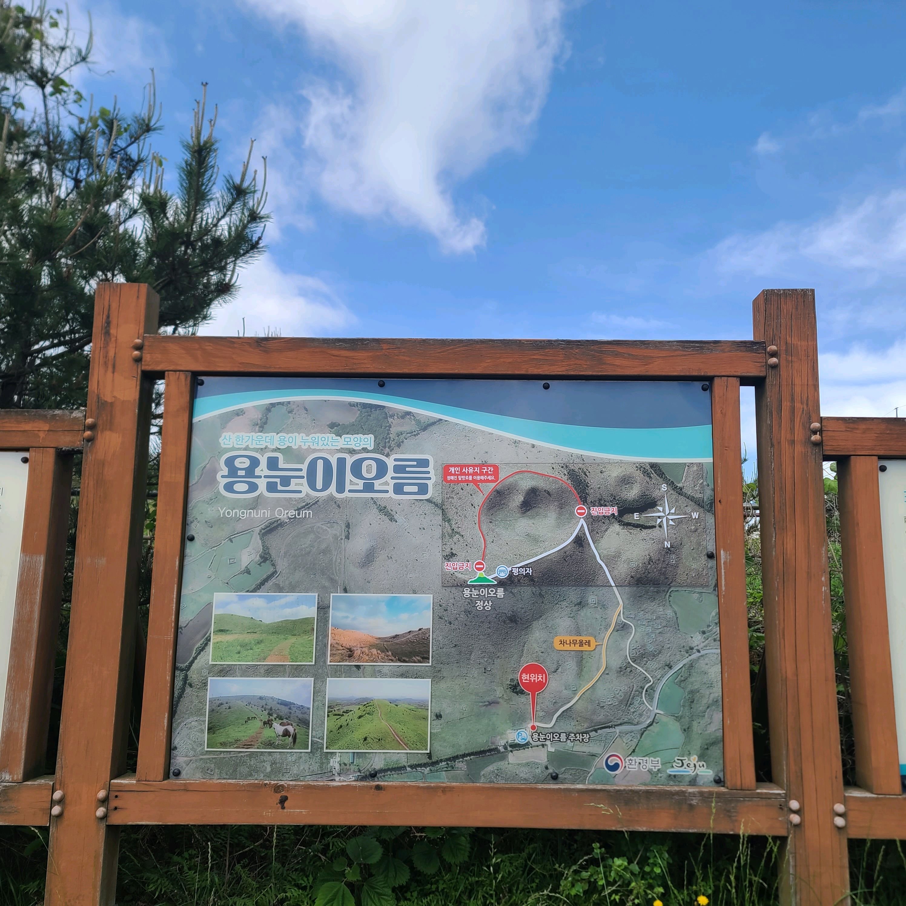 한 가운데가 움푹 패어있어 용이 누웠던 자리 같다는 뜻을 가진 용눈이오름. 해발 247m 이고 오름 높이 88m로 쪼리신고 올라가도 무리 없을정도로 아주 완만하고 올라가기 쉬웠어요. 해질무렵에 가면 눈호강하는 일몰도 볼 수 있고 정상에서 여러 오름들과 성산일출봉까지 자연경관이 너무 멋진 오름이에요.