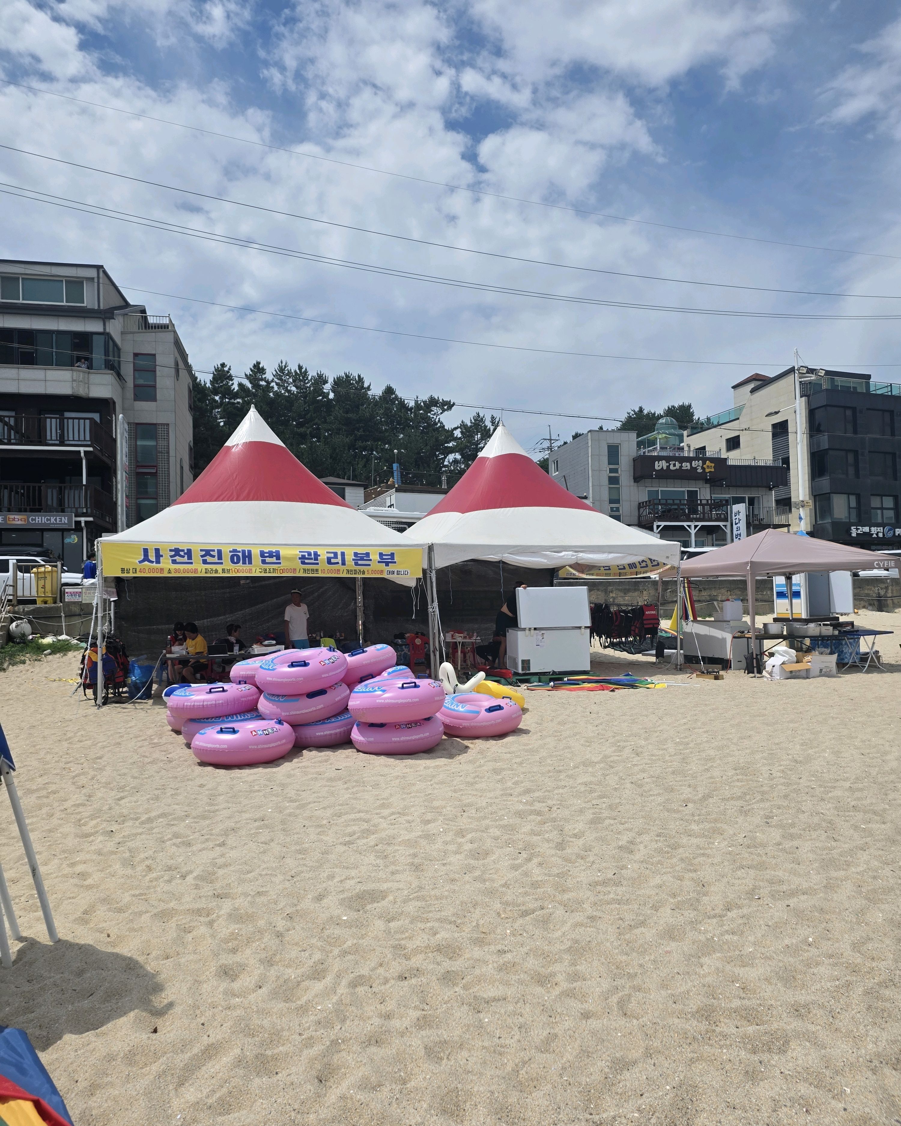 2년 연속 방문한 사천진 해변, 작년에 오전 11시쯤 도착했더니 주차하기 힘들어서 올해는 오전 8시 반 오픈런 했고 주차 수월했어요(세븐일레븐 사천진리점 주변에 주차하면 놀기 편함) 평상 대여 가격 작년에 5만원이었는데 4만원으로 인하했더라고요 :) 물 맑고 취사 가능하고 수상 액티비티도 즐길수 있고 주변 식당에서 회나 치킨 사다먹을 수 있어서 해수욕장으로는 최고예요!