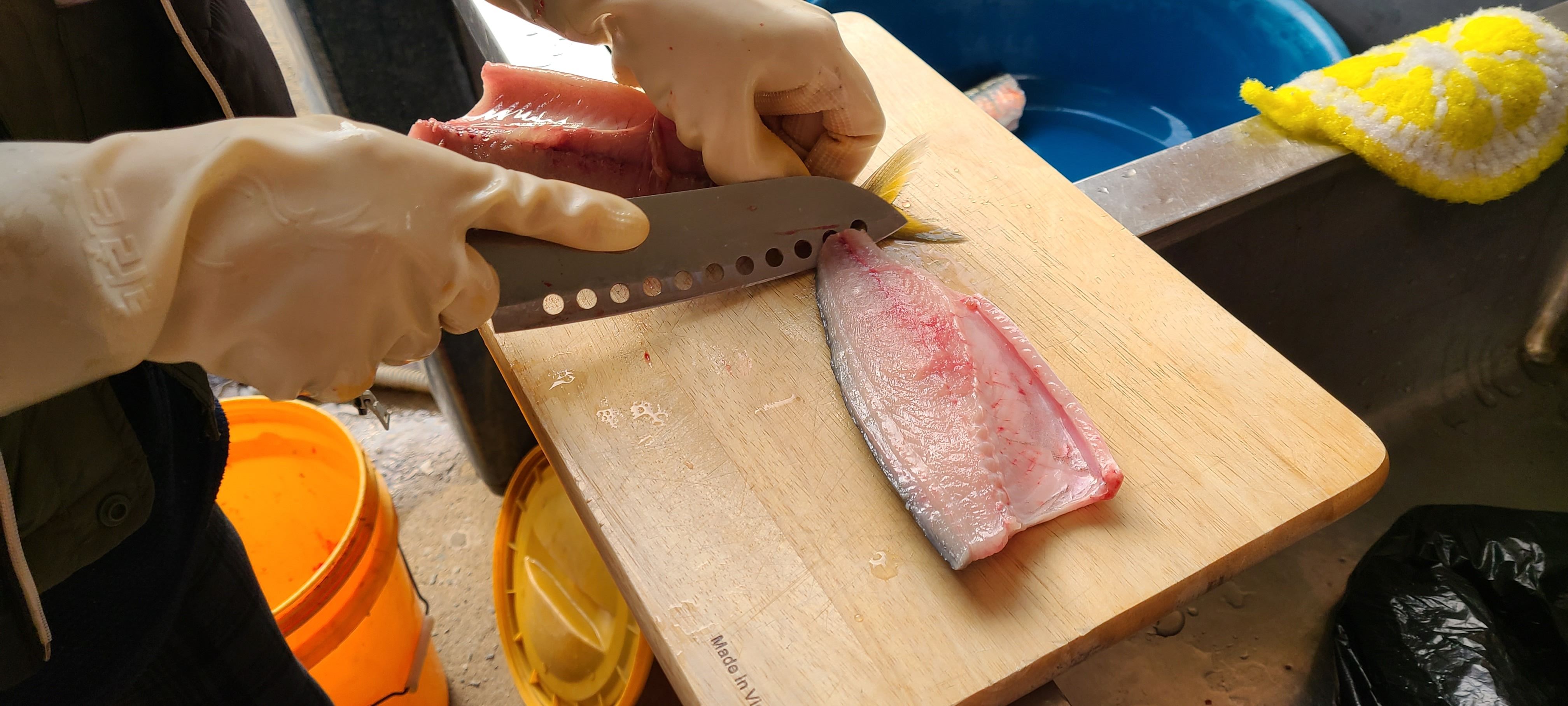 잡은 고등어와 전갱이는 민박집 사장님 가르침대로 회를 뜨고 나눠주신 김치도 더해 소박하지만