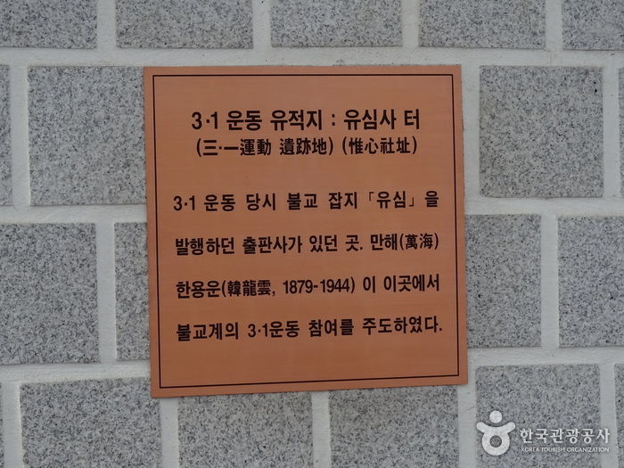 유심사는 만해 한용운 스님이 1918년 9월 월간지 ‘유심’을 창간하고 제3호까지 발행한 곳으로 만해 한용운 스님의 거처로 사용되던 곳이다.