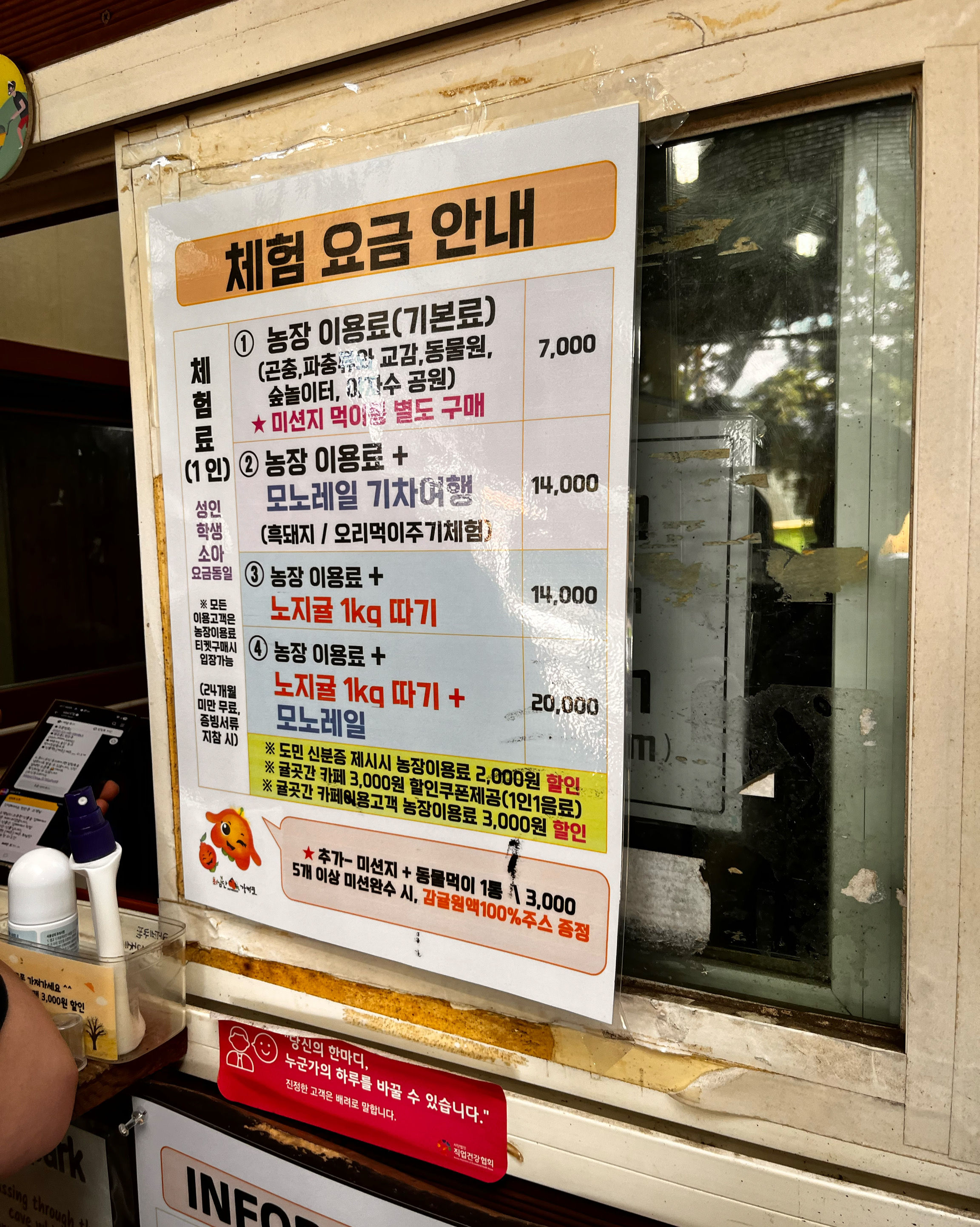 일정은 일단 모노레일을 타고 돼지 먹이주기체험 하고 모래놀이터에서 한시간 놀고 곤충관으로 이동하고 야외에 타조 당나귀?사슴 등등 먹이체험하고 마지막에