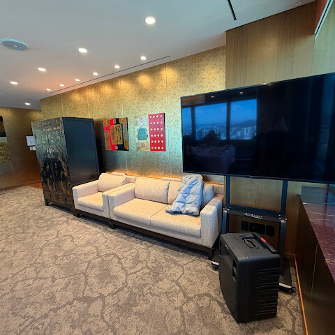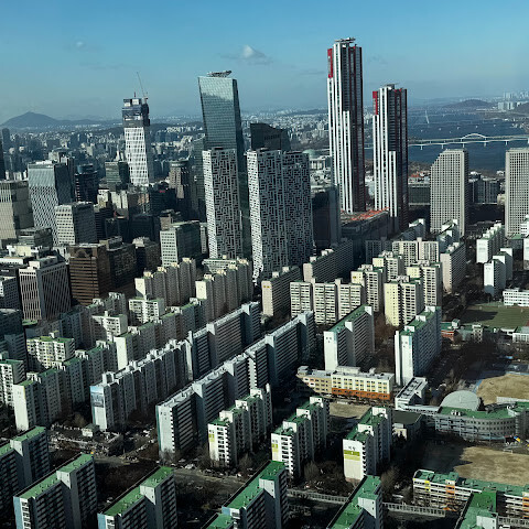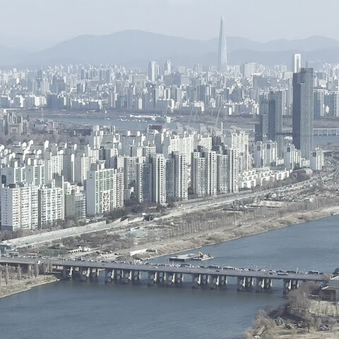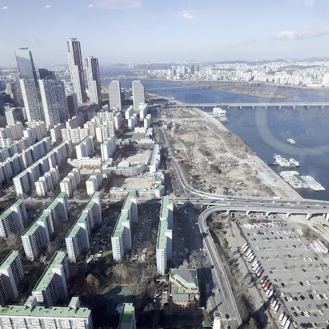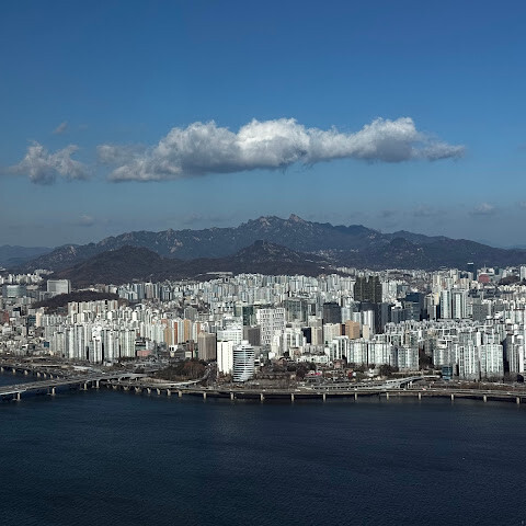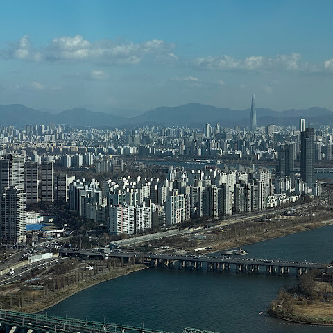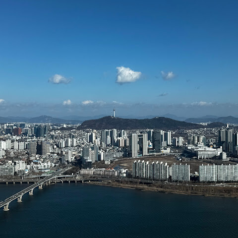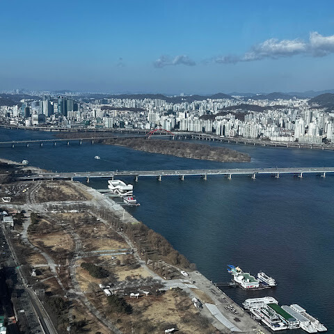 여기 앉아서 창밖을 내다보면 서울의 전경이 한눈에 들어와요. 강, 건물, 스카이라인, 모든 게 다 보이죠.