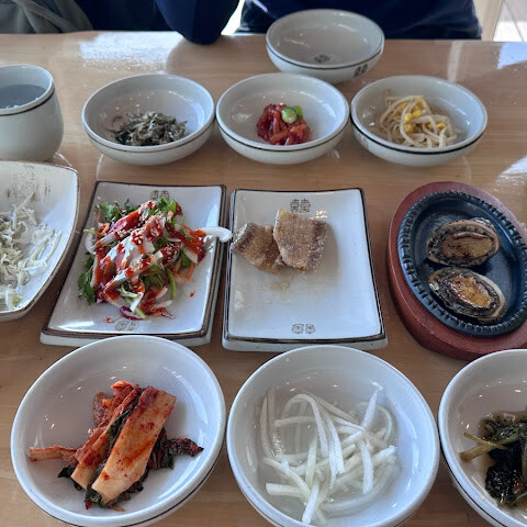 점심으로 고등어 조림, 생선회 비빔밥, 도토리전을 먹었어요. 정말 맛있었고, 요리와 함께 나오는 다양한 사이드 메뉴도 즐거웠어요. 강력 추천합니다!