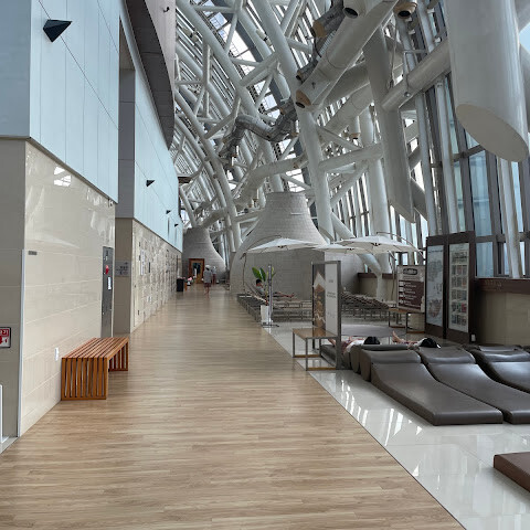 우선, 규모가 엄청나요! 백화점역에서 버스를 타고 4번 게이트로 가시면 됩니다. 1층에서 부산패스로 체크인 후 2층으로 올라가세요. 신발을 벗어야 하고, 짐은 직원에게 맡길 수 있어요. 짐을 싣고 나면 옷을 벗고 샤워를 한 후 온천욕을 하고 다시 헹군 다음, 유니폼으로 갈아입고 사우나를 즐기면 됩니다. 시설이 정말 새롭고 깨끗해서 야간 비행 후 피로를 풀기에 딱 좋아요. 다른 사우나에 비해 등받이 의자가 훨씬 많아서 좋았습니다. 손목 밴드로 계란과 찹쌀국도 주문할 수 있고, 계산은 나갈 때 하면 됩니다. 시간이 된다면 모든 층을 다 둘러보는 걸 추천해요. 특히 3층 휴게 공간이 정말 멋집니다!