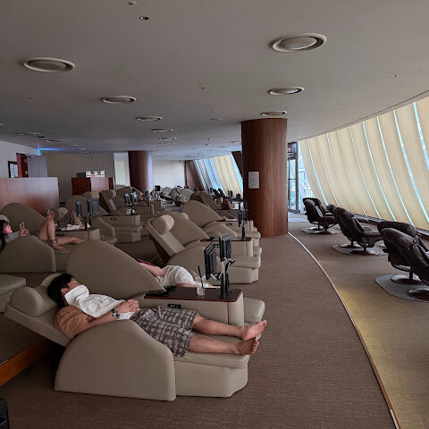 우선, 규모가 엄청나요! 백화점역에서 버스를 타고 4번 게이트로 가시면 됩니다. 1층에서 부산패스로 체크인 후 2층으로 올라가세요. 신발을 벗어야 하고, 짐은 직원에게 맡길 수 있어요. 짐을 싣고 나면 옷을 벗고 샤워를 한 후 온천욕을 하고 다시 헹군 다음, 유니폼으로 갈아입고 사우나를 즐기면 됩니다. 시설이 정말 새롭고 깨끗해서 야간 비행 후 피로를 풀기에 딱 좋아요. 다른 사우나에 비해 등받이 의자가 훨씬 많아서 좋았습니다. 손목 밴드로 계란과 찹쌀국도 주문할 수 있고, 계산은 나갈 때 하면 됩니다. 시간이 된다면 모든 층을 다 둘러보는 걸 추천해요. 특히 3층 휴게 공간이 정말 멋집니다!