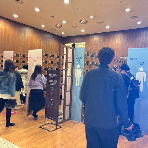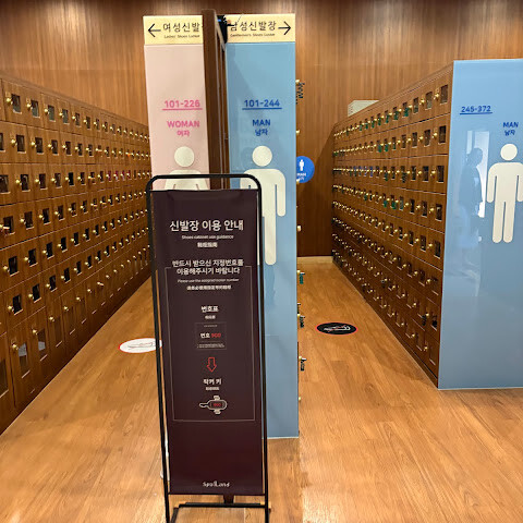 8. 시간이 충분하다면 샤워를 한 번 더 하고, 탈의실로 돌아가서 카운터에서 손목 밴드를 스캔하여 결제한 후, 출구 쪽 신발장에서 신발을 꺼내고 열쇠를 다시 사물함에 넣고 나가시면 됩니다.