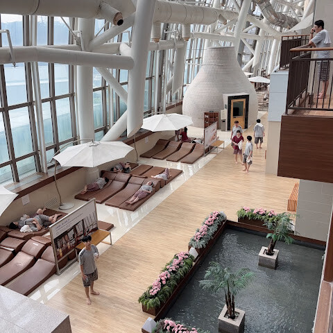 이곳은 정말 휴식과 재충전을 위한 최고의 장소입니다. 다양한 종류의 사우나, 토핑을 얹어 직접 라면을 해먹을 수 있는 다이닝 공간, 낮잠을 즐길 수 있는 해먹, 시청각 시설, 야외 족욕 공간까지 갖춰져 있습니다. 부산 여행 중 두 번이나 방문했어요. 첫 번째는 여행 둘째 날, 4시간 이용권이 있는 부산 패스를 사용해서 갔는데, 너무 늦게 도착해서 한 시간 정도밖에 즐기지 못했어요. 두 번째는 7일째 되는 날, 귀국길에 공항으로 가기 전에 무제한 이용권을 구매해서 꽤 오랫동안 머물면서 낮잠도 잤습니다. 정말 최고의 경험이었어요.