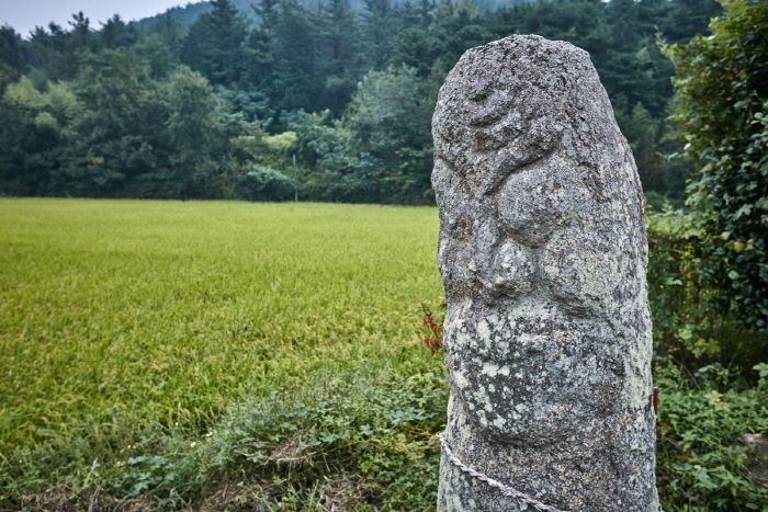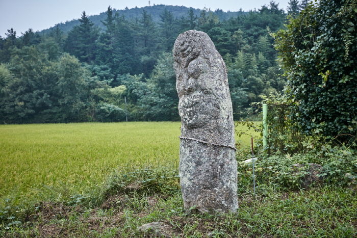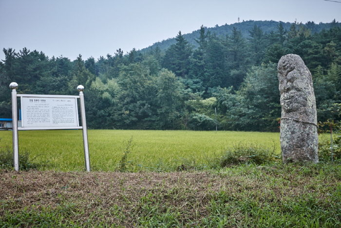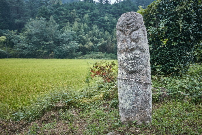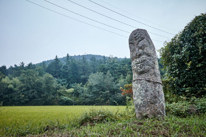 관산읍에서 방촌으로 넘어드는 국도 23호선 도로변, 좌우측에 화강석으로 된 2기의 석장승이 서 있다. 이중 서쪽에 위치한 장승은 ‘男長栍’, ‘벅수’, 명문에 따라 ‘鎭西大將軍’으로 불리운다. 이 장승과 마주하는 동쪽의 장승은 ‘미륵석불’, ‘벅수’, ‘돌부처’, ‘女長栍’, 등 다양하게 불리우나 명문은 없다. 총크기와 머리크기의 비율을 보면 진서대장군이 1 : 4 미륵석불이 1 : 2이다. 전체 크기에 비해 몸통 둘레가 작고 각 면이 각을 이룬 장방형에 가까운 형태이다. 반면에 전체크기에 비해 둘레가 크고 각 면에 각이 없는 원통형인 미륵석불은 머리에 비해 몸통이 풍만하다. 남・여 장승이 모두 두부(頭部)외에는 별다른 조식이 없다. 진서대장군은 전체적으로 간략하고 평면적인 조각이다. 얼굴이 있는 위쪽의 폭이 아래보다 조금 넓다. 얼굴에는 왕방울눈이 이중선각(二重線刻)으로 처리되어 있고 주먹코가 넓은 면적을 차지하고 있다. 양옆 볼까지 찟어진 입을 보면, 입술이 두텁고 입꼬리가 귀밑으로 치켜 올라가 전체적으로 익살스럽게 활짝 웃는 형상이다. 목 밑에서 가슴의 명문 윗쪽까지 역삼각형의 수염이 넓게 선각되어 있다. 그 수염 밑에서부터 좌대까지 ‘鎭西大將軍’이라는 명문이 새겨져 있다. 한편 미륵석불은 진서대장군에 비해 풍만하면서도 조각이 깊고 무서운 인상을 주고 있다.