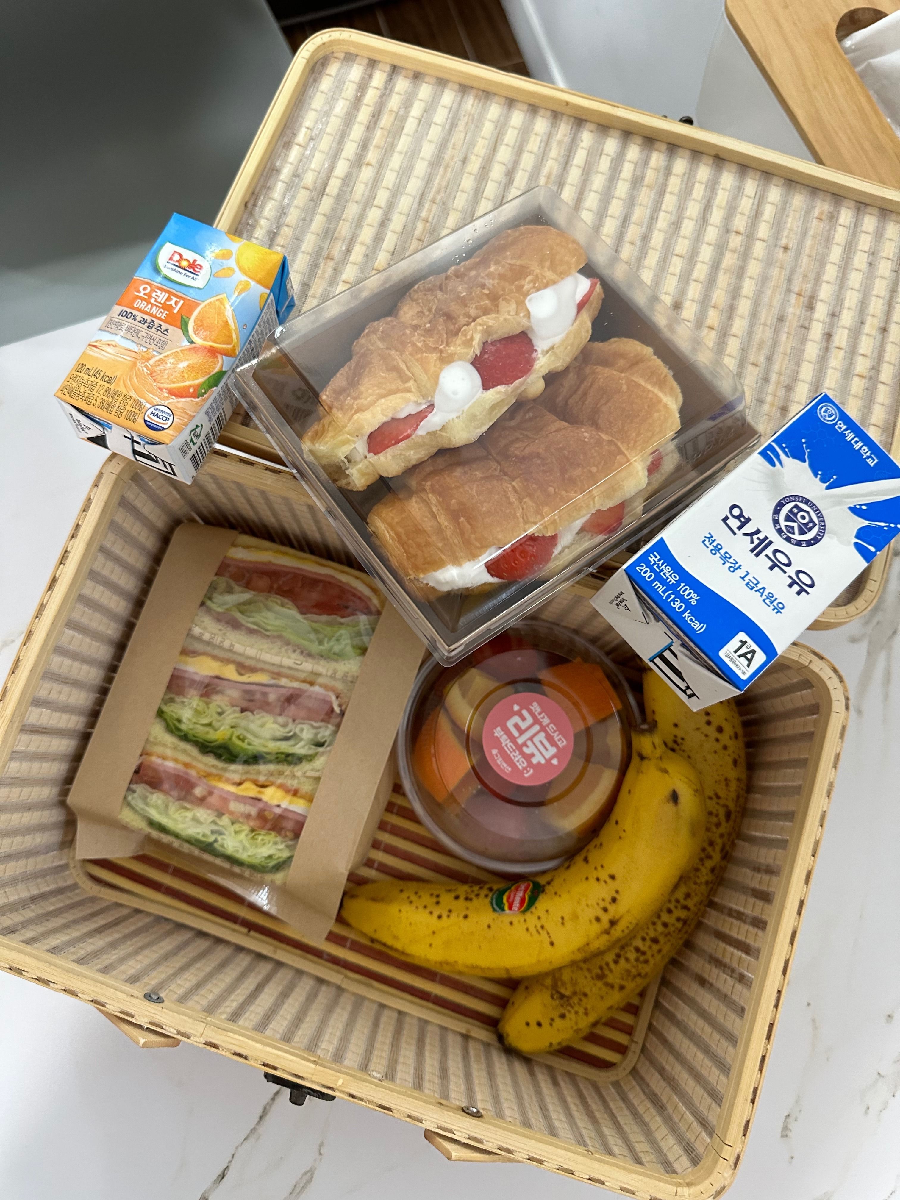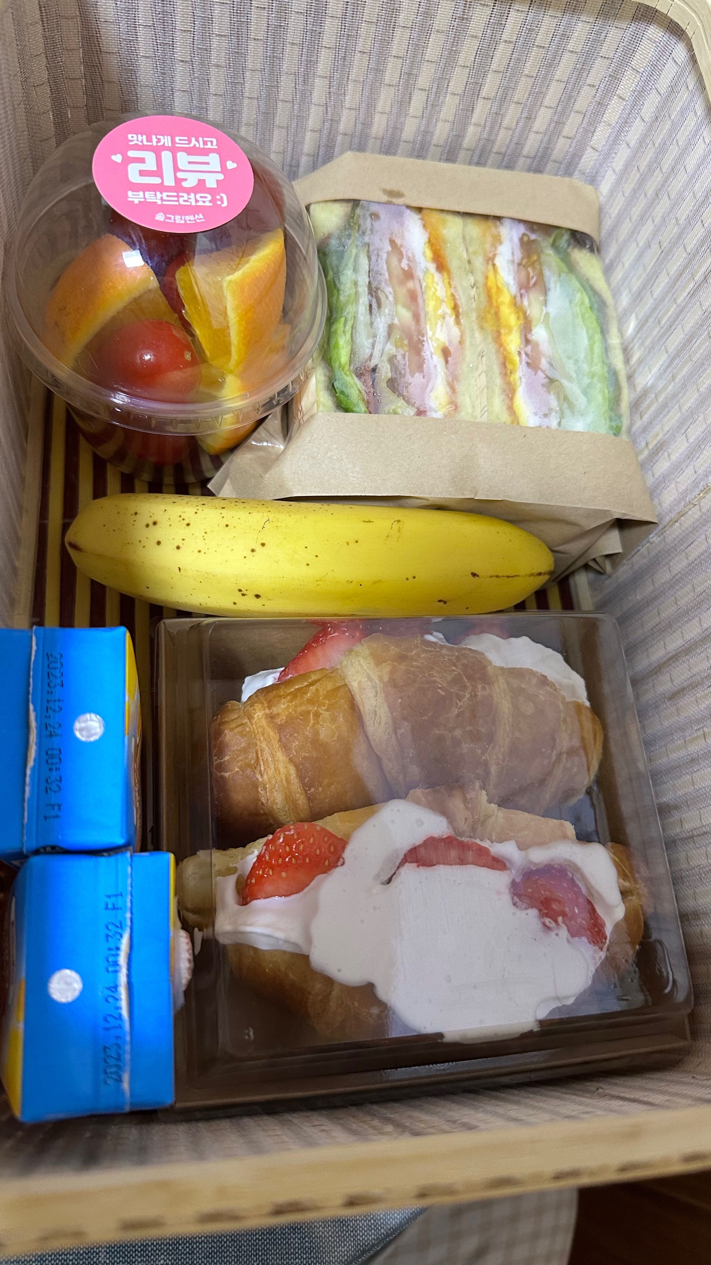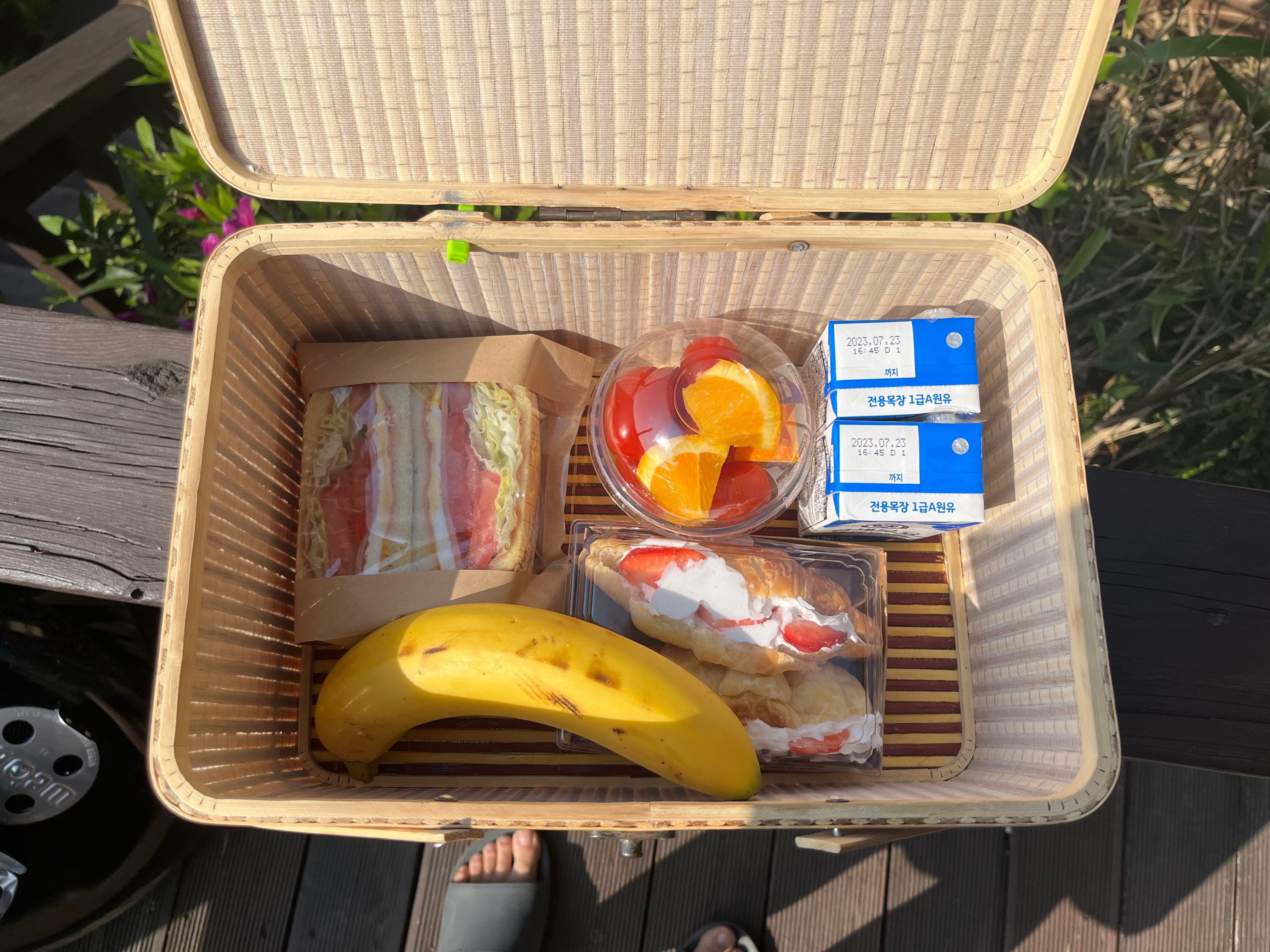 조식은 샌드위치와 과일, 직접 구우신 빵에 우유 먹었습니다^^