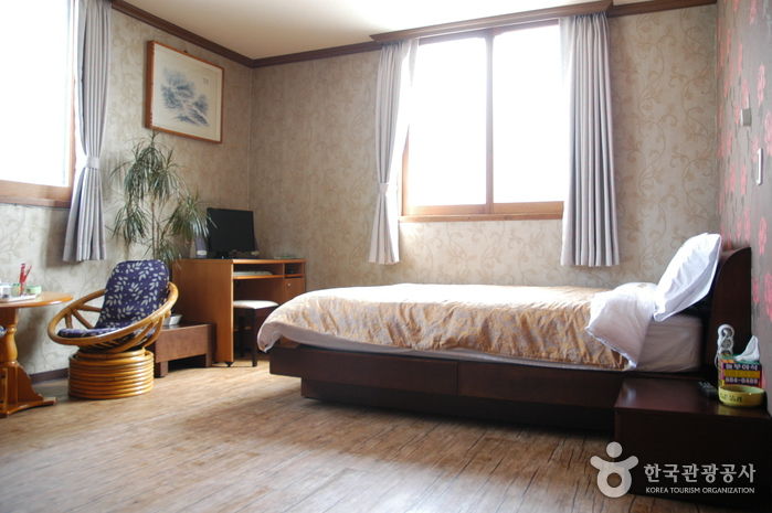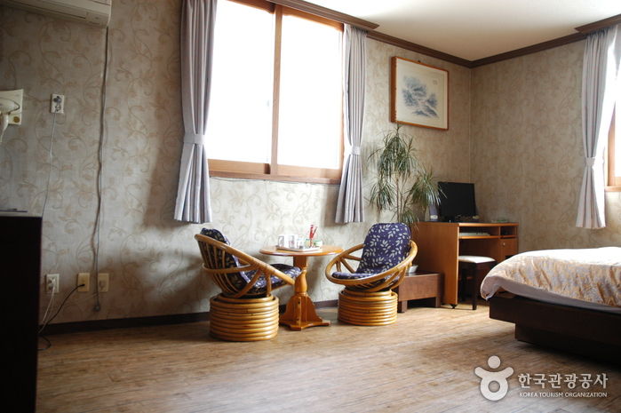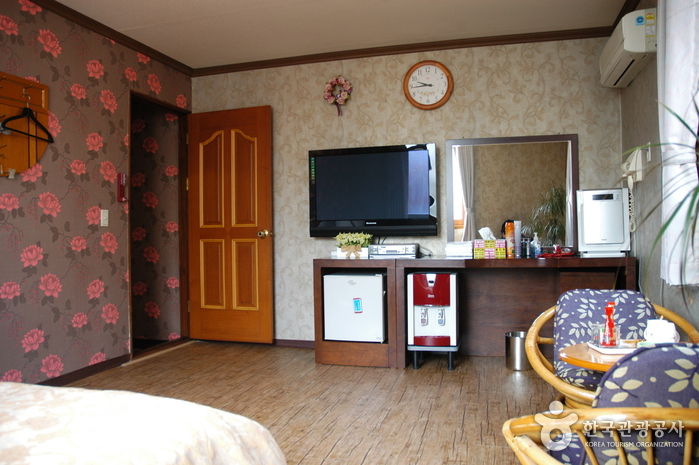 하얀 건물에 파란 줄무늬가 인상적인 모텔로 정문에 심어놓은 큰 나무를 지나 입구로 들어가면 말끔히 정리되어 있는 데스크가 바로 보인다. 내부로 들어가면 기하학적인 포인트 벽지가 세련미를 주는 모던풍의 방이다. 큰 창문을 통해 들어오는 햇살이 환하게 비춰 방안 전체를 화사하게 만든다. 커튼이 있어 낮에도 언제든지 숙면을 취할 수 있는 편리함이 있다. 화려한 무늬의 침대커버는 깨끗하게 세탁되어 기분이 좋다. 넓은 침대는 물론 화장대와 최신형 컴퓨터 등이 잘 갖춰져 있다. 티 테이블이 있어 잠깐의 휴식을 취하기에 안성맞춤이다. 화장실의 청소상태가 매우 깨끗하며 욕조가 있어 샤워하는데 편리하다.