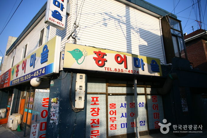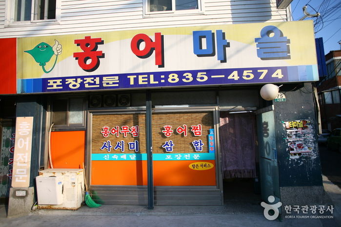 홍어마을은 홍어삼합이 가장 인기 메뉴이며 홍어무침, 홍어탕 등 홍어를 이용한 요리를 코스처럼 맛볼 수 있다.