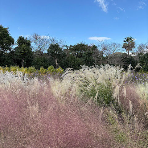 지금은 10월이에요. 동백꽃은 피지 않았지만, 몽환적인 분홍색, 보라색, 초록색 억새꽃을 감상할 수 있어요.