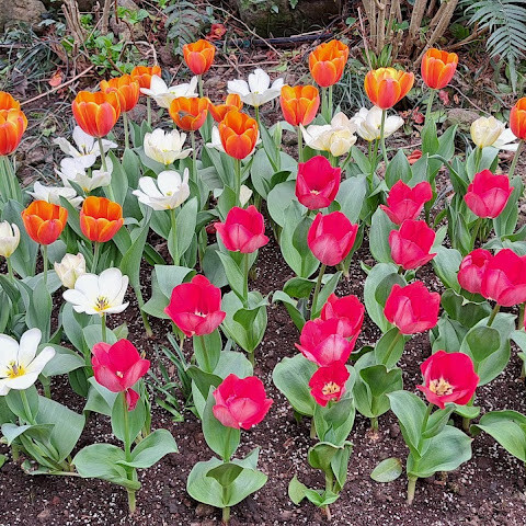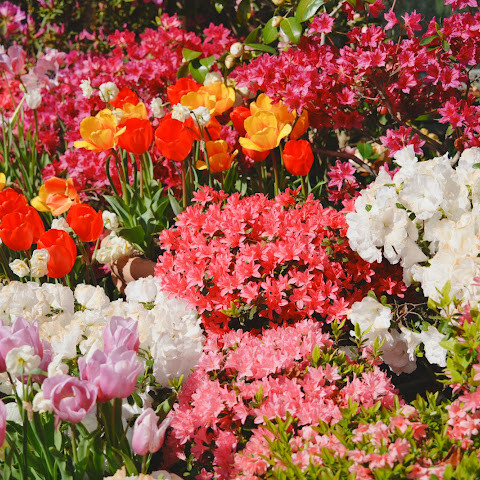 동백꽃은 거의 졌지만, 수국, 튤립, 철쭉 같은 다른 꽃들은 여전히 피어 있습니다.