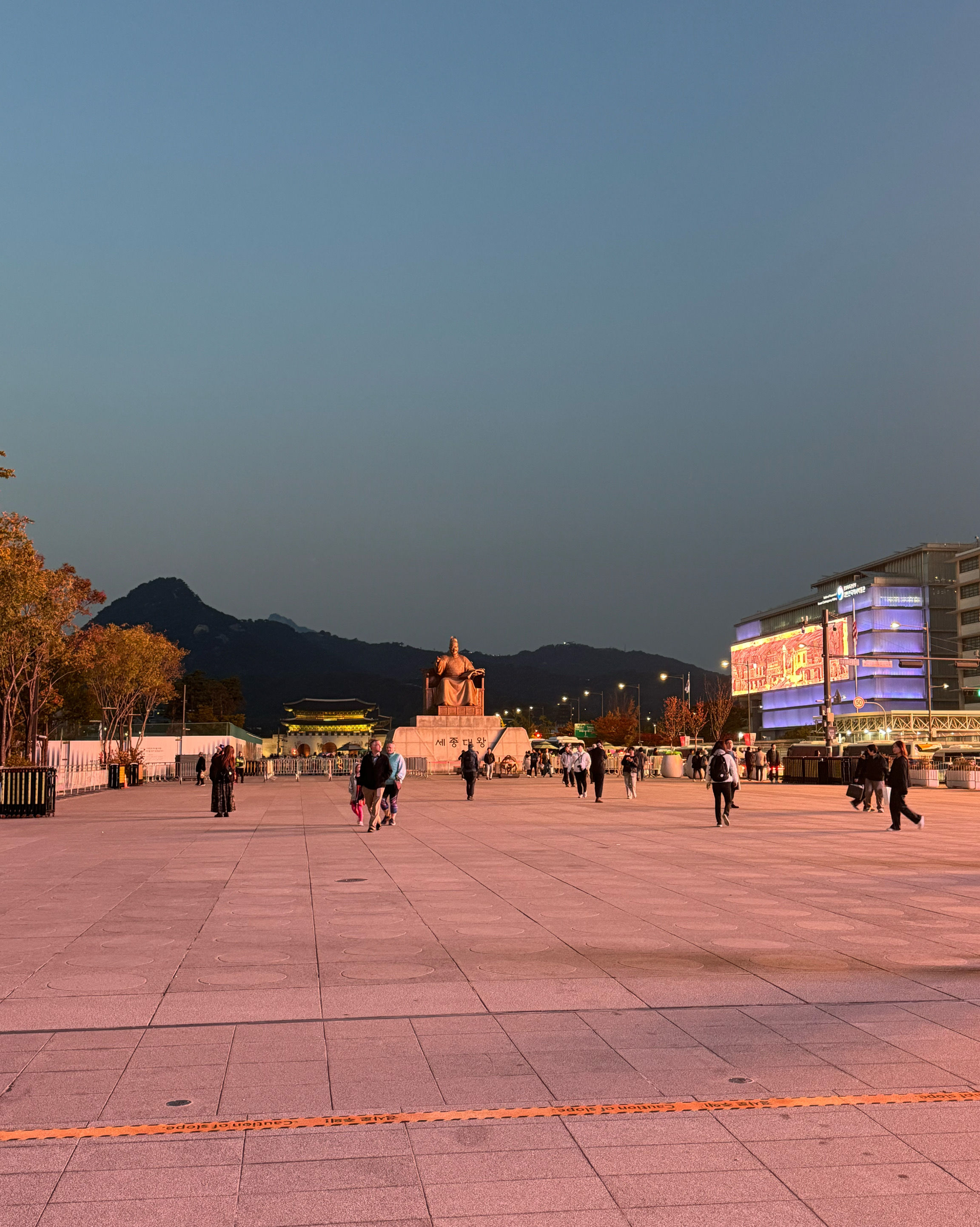 광장 한쪽 끝에서 시작하여 길을 따라 역사적인 인물과 기념물을 천천히 둘러보았습니다. 반대편 끝 광장은 경복궁으로 이어집니다.