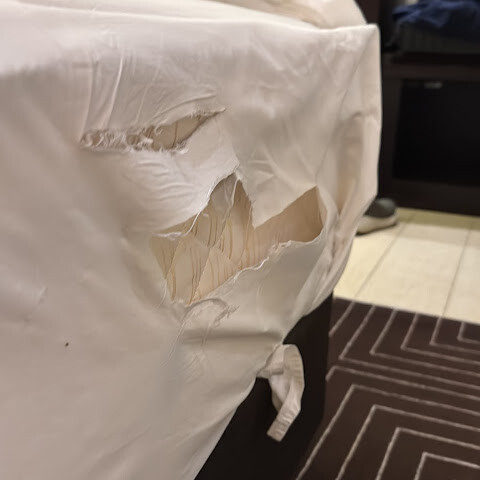 침대 시트에도 큰 구멍이 나 있고 찢어진 곳이 많았어요. 이불 커버도 없이 시트만 덮는 방식도 마음에 안 들었고요.