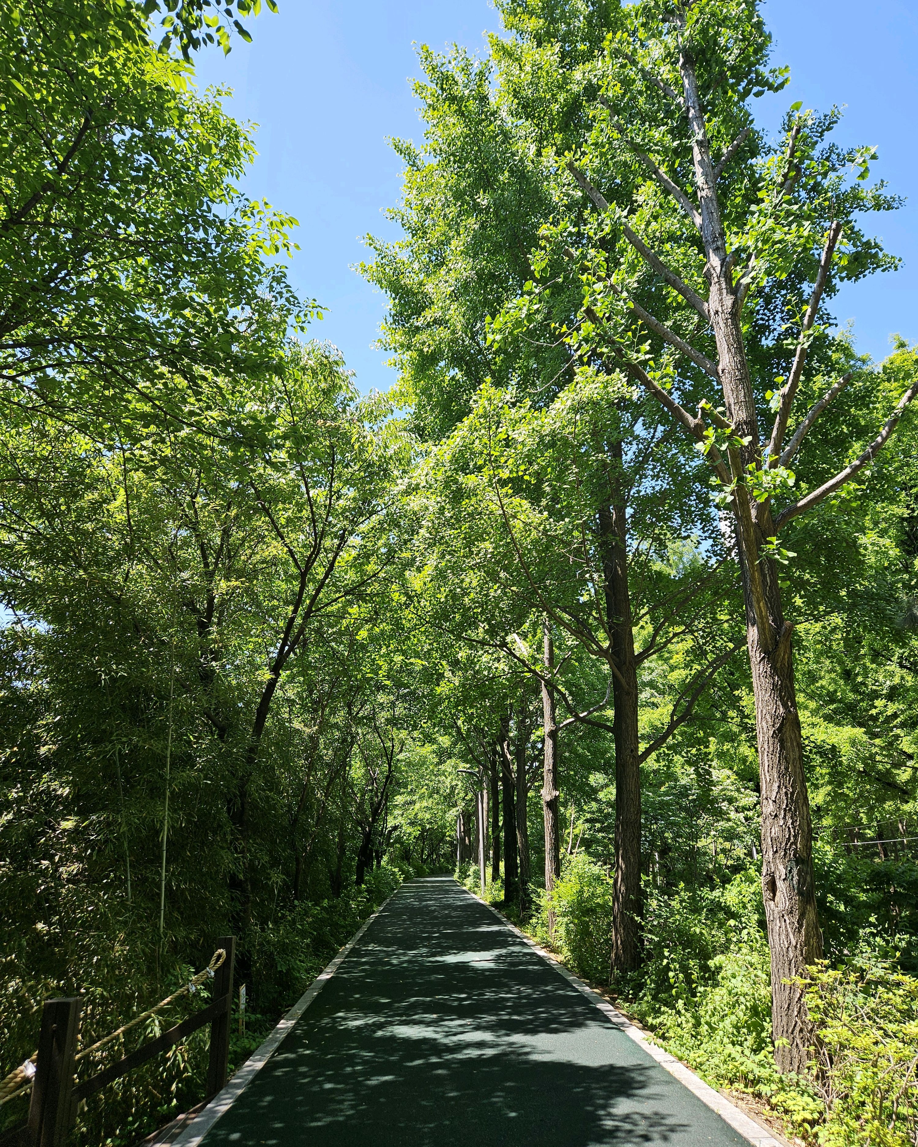 걷기좋은 푹신한 산책로는 나무들이 울창해 그늘져 있고