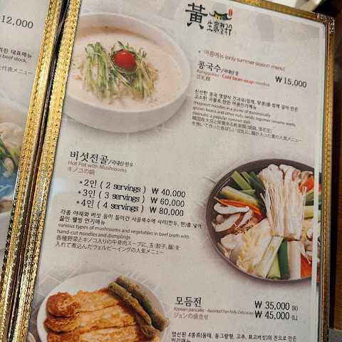 저희는 파스타와 만두가 들어간 커다란 수프 접시를 주문했습니다. 접시가 매우 큰 프라이팬에 담겨 바로 눈앞에서 불 위에 올려져 나오는 방식이 흥미로웠습니다. 스파게티 만두와 버섯이 들어간 이 요리는 12원이었고, 4~5명이 먹기에는 양이 꽤 많았습니다. 저희는 소고기 육수에 버섯을 넣은 수프도 주문했습니다. 만두는 따로 주문했는데, 한 그릇에 일곱 조각이 들어 있고 꽤 커서 한 개면 충분해요. 한 그릇만 먹어도 두세 명이 먹을 수 있을 정도예요. 절인 김치와 백김치는 요리와 함께 나옵니다. 생선구이, 버섯, 고추도 함께 곁들여 왔는데, 손님 접대에 좋은 간식이었어요. 모든 요리는 12원 정도예요. 한 번 앉아 볼 수는 있지만, 특별하거나 특별하다고는 할 수 없어요. 저희에게는 그냥 평범한 방문이었어요. 더 많은 것을 기대했거든요.