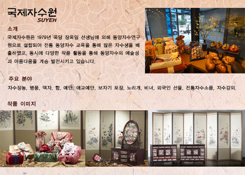 1979년 개점한 국제자수원은 한국적 전통 문양을 가지고 자수(刺繡, embroidery)를 접목시킨 공예품을 전시 판매하고 있다. 특히 판매하는 모든 제품은 수공예로 제작되어 섬세하고 깊이가 있다. 국제자수원은 청와대의 귀빈들이 항상 방문하는 곳으로 유명하며, 외국인 관광객을 위한 자수 강습을 체험할 수 있다.