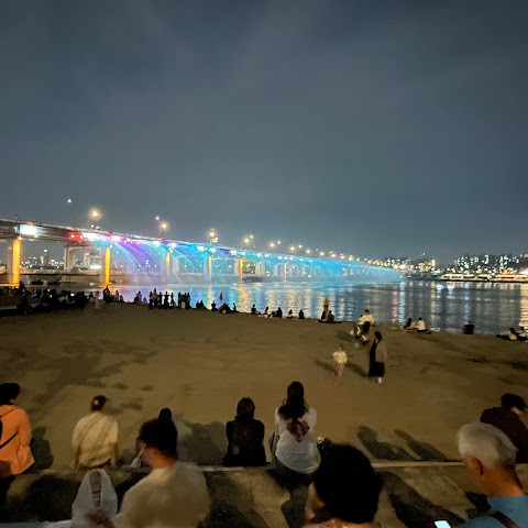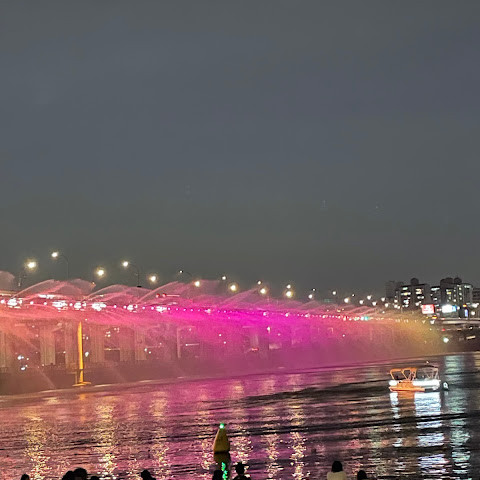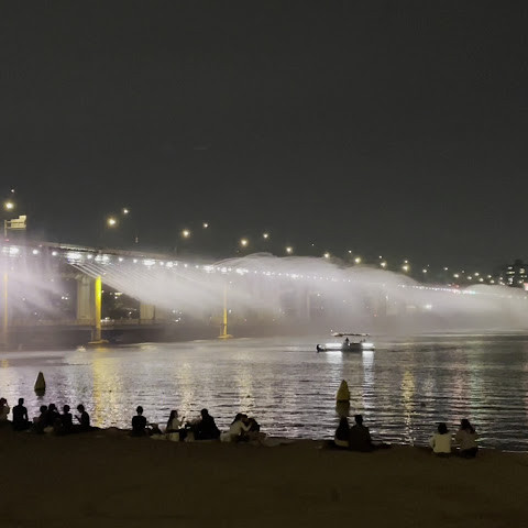 아들이 K-드라마 같은 삶을 살고 싶어해서 반포 한강공원으로 결정했습니다. 한강에서 라면을 먹는 것이었습니다. 지하철을 타고 고속버스 터미널 역까지 가서 공원에 도착하기까지 약 10분 정도 걸었습니다. 저녁 7시 조금 지나서 도착했습니다. 공원에 CU 편의점이 있었지만 안은 정말 붐볐습니다. 가게에 들어가려면 줄을 서야 했습니다. 모두가 라면, 음료, 간식을 사려고 해서 안이 너무 어수선했습니다. 계산을 마치고 나서 또 다른 혼란스러운 상황이 우리 앞에 나타났습니다. 라면 조리대였습니다. 다행히 영어를 이해하는 두 명의 어린이를 만나 라면을 사용하는 방법을 배웠습니다. 공원에서 라면을 먹는 것은 절대 놓쳐서는 안 될 경험입니다. 우리는 반포대교에서 공원에서 바라볼 수 있는 무지개 분수 쇼를 보기 위해 그곳에 머물렀습니다. 쇼는 30분마다 있습니다. 아직 한 번이라도 해봤다면 좋겠지만, 너무 어수선해서 두 번째는 하지 않을 것입니다.