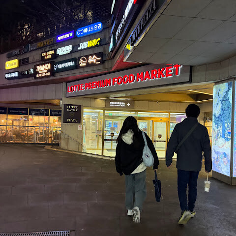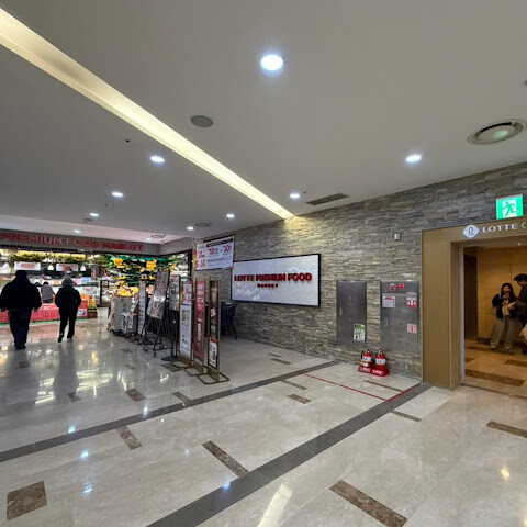 모든 정류장에 정차하는 공항 열차가 더 저렴하지만 롯데까지 걸어가려면 꽤 멀어요. 2번 출구에서 지상으로 내려가는 엘리베이터가 있는데, 계단 오른쪽에 있는 숨겨진 L자형 구석에 있습니다. 엘리베이터 표지판을 찾으세요.
