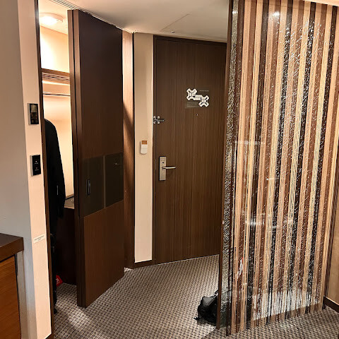객실에는 성인 2명과 어린이 1명이 묵었고, 더블 침대 1개와 싱글 침대 1개가 있었습니다. 큰 여행 가방 3개 모두 펼칠 수 있을 만큼 넉넉했습니다. 유일한 단점은 카펫이 너무 가려웠다는 점인데, 객실 청소 직원이 청소기로 청소해 주어서 괜찮아졌습니다. 위치는 정말 좋았고, 택시 요금도 저렴해서 3~4명이 이용하기에 부담이 없었습니다. 지하철역보다는 조금 멀지만, 쇼핑 후 다리가 피곤하다면 우버를 이용하는 것을 강력 추천합니다! 👍